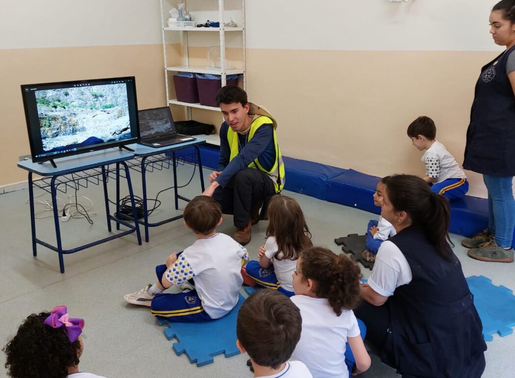 Recebemos a visita do ex-aluno Pedro Gouveia Bauli que estudou aqui na Villa dei Bambini, formando-se em 2004 e veio realizar uma apresentação relacionada aos projetos para as turmas do Maternal A (A caverna dos pequeninos), Jardim I A (Caminho das águas) e Jardim I B (Colecionadores de buracos).